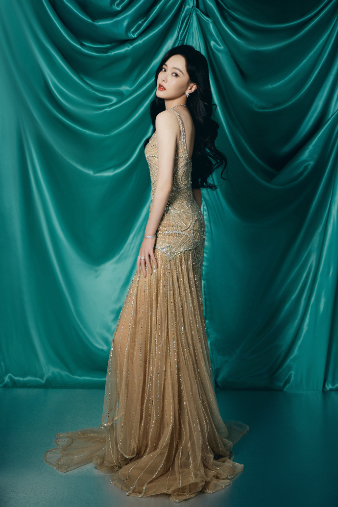 降服以暖和裸色为底,手工立体刺绣将枝桠端倪与细碎亮片交汇成春日花坛,每一派纹路皆在光影里流动着抽象光芒。纤细的吊带打算利落勾画出她优厚的肩颈线条,修身鱼尾剪裁贴合腰臀弧线,把东方女性的温婉与唯妙身姿衬得恰到平正,既不外分张扬,又自带高等感。