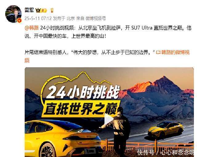 事情的缘由,还得从韩路那条“24小时挑战,直抵宇宙之巅”的视频提及。说白了,等于韩路坐飞机到拉萨,然后开着小米SU7 Ultra去珠峰大本营散步了一圈。这选题,乍一听挺唬东说念主,又是挑战,又是宇宙之巅的,噱头透顶。雷军切身下场转发,更是把这视频推上了风口浪尖,播放量蹭蹭往上升。