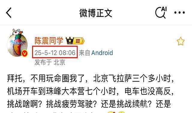 底本嘛,大众望望干扰也就结果。谁知说念,陈震骤然冒出来,在外交平台上发了这样一段话:“北京飞拉萨三个多小时,机场开车到珠峰大本营七个小时,电车也没高反,挑战啥啊?挑战疲困驾驶?一经挑战续航?一经啥?”