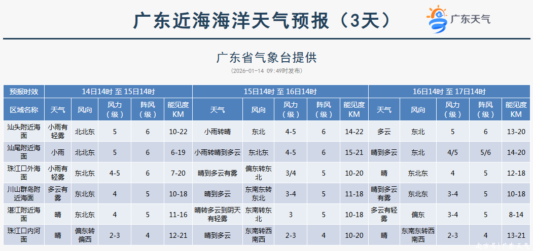 海面大风预告:14日,粤东海面和台湾海峡东北风6级阵风7级,巴士海峡和南海东北部海面东北风6~7级阵风8级;15日,粤东海面和台湾海峡东北风5~6级转5级,巴士海峡和南海东北部偏东海面东北风6级阵风7级;16-17日,巴士海峡和南海东北部偏东海面东北风6级阵风7级。